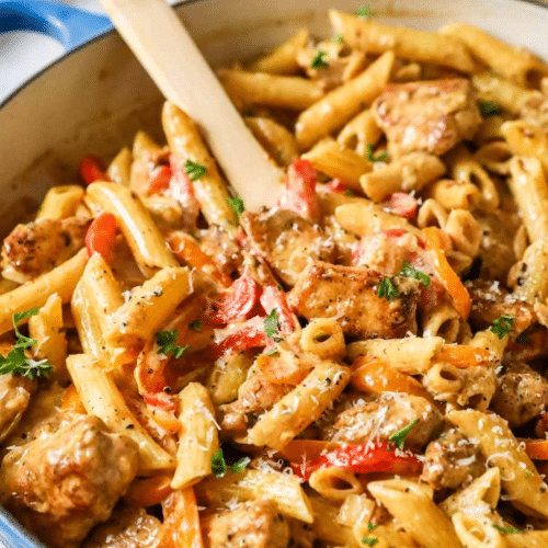 Roomsaus, Currypasta, Kipfilet, champignon, Paprika, mozzarella in de oven.
